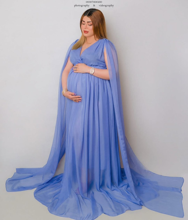 پیراهن حریر بارداری با استین های شنل دار حالت پروازی فری سایز در کالیته رنگبندی مناسب مجالس و عکاسی بارداری