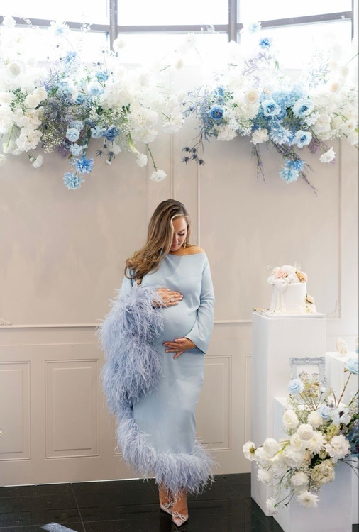 پیراهن بارداری آستین کلوش با پر سوزنی کارشده از کالکشن لباس بارداری آتلیه پرگشا